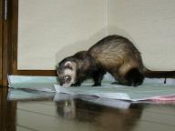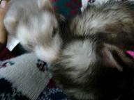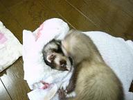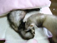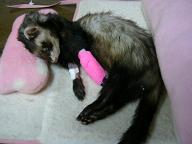会社から帰ると、ハンモックからマシュの体がだらりと垂れていた。「とうとうやったか。。。!」と、最悪の事態 を覚悟してマシュをつかむ。まだ温かい! マシュの体を起こすが、マシュの目は閉じたまま。力なく手足が垂れ下がった。ただ、まだ息はあった。 至急震える手でブドウ糖をスポイトで口に入れる。マシュが嫌がった。大丈夫だ。嫌がる力があるのは、 まだ大丈夫ということだ。 次にふやかしたフェレットフードを3回に分けて、口を無理やりこじ開けて入れる。 10年前に犬が弱った時にやった方法だ。とにかく食べさせろ。それだけ、頭にあった。 マシュの目はまだ開かない。体温がどんどん下がる。 近くにあったお気に入りのマフラーにマシュをくるむ。マフラーはもうどうなってもよかった。 糞まみれになってもおしっこがかかっても、胃液だらけになっても、マシュが助かるならどうでもいい。 車のエンジンをかけて夜9時からやっている夜間動物病院へ走る。 マシュの体温が下がる。途中で車を停めて、私はジーパンを半分おろした。ジーパンの上からよりも、 直接私の肌が当たったほうがマシュに私の体温をあげられると思ったからだ。 (今思えば変質者に近いかもしれない。。。) 不思議と、マシュの体温が戻ってくるのが分かった。 動物病院へ着く頃には、マシュは自分で首を振ったり、むにゃむにゃ と口を動かすようになっていた。 |