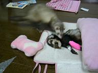 帰ったら元気になり、水を自分で飲む。 それからフェレットトンネルを1回 くぐって眠りについた。 よ、よかった。。。 |