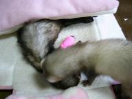 仕方なくペットシティに会社帰りに寄って フェレットバイトとかいうの買って来た。 あとマシュの好きな激安フェレットフードも。 やっとなめてくれた。 れぱんもやってきてペロペロ。 最後にお互いのお口をペロペロ。 我慢しきれずにマシュがれぱんのお口を ガブリ。 れぱん、びっくり。 本日のお会計:フェレットバイト代 1260円 |
