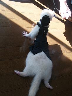 | また私のお友達で、 「腫瘍が背中にできてしまってそれを引っ掻いてしまう」 そんなフェレットのために丈の長めのズボン&ベストを ご注文くださった方がいます。 傷口を引っ掻いてしまい、止血剤が欠かせなかったという かわいい真っ白なフェレット。 無事に洋服を気に入ってもらえたようで フェレットは24時間その服を着て生活してくれています。 足が傷口に届かないので出血もなくなったそうです。 いただいたメールを読んで、これまた何だか涙。 |