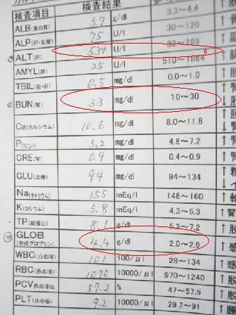 | 肝臓の数値がちょっと高め。 腎臓の数値は高めではあるけれど、問題があるとは言えない。 たんぱく質が高めのフードを多めにブレンドするつもりなので 腎臓の数値も1週間後(2回目の血液検査)に見てみるつもりです 数値が高くなっていれば、腎臓に負担がかかっているということ。 でもなぁ。。。たんぱく質が多目のエサの方が うんPの調子がいいんだよなぁ。。。 |