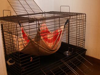 | フェレットはハンモックが好きなので、ケージや部屋にハンモックをかけてあげてください。 寒い時には2枚重ねで潜れるタイプのハンモックがお勧めです。 チラリと中を覗きたくなりますが、フェレットにもプライバシーがありますので「中を拝見します。」と一声かけてから 中を見てみましょう。 ものすごい寝相で寝ているフェレットを見ることができるはず。 ※ハンモックの素材に注意してください。フェレットによってはボアやフリースなどの布を食べてしまう場合があります。 |