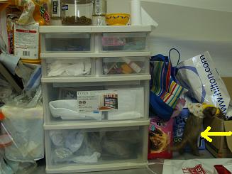 | ペットシーツやら何やらが まとまっている(まとまっているのよ、これでもっ。)場所です。 飼い主の「つい買ってしまった物」がたくさん入っています。 最初は引き出しに全部収まっていたんだけどなぁ。。。 いつの間にこんな周辺にまで積みあがってしまったのかしら。 |