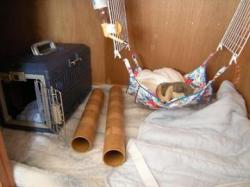 | ハナさんは押入れをフェレットの遊び場として開放なさっています。 お昼寝用のケージ トンネル ハンモック 潜るための薄手の布団 きっとフェレットは楽しそうにこの中で遊んでいるんでしょう♪ |