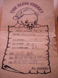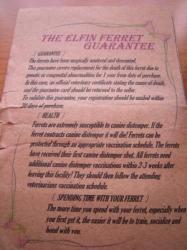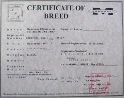 | こちらがマーシャルファームからの証明書。 2003年1月以降のマーシャルフェレットは首のところに マイクロチップが埋め込まれています。 (ひろさん、ありがとうございます。) れの字もマーシャルでしたが、マイクロチップについて 何も知らなかった私は 「しこりだ!癌かもしれない!」 と、危うく動物病院に連れて行くところでした。。。 |