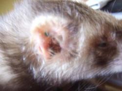 | マーシャルファームの2つの刺青の意味: 1つは避妊・去勢手術を行った時に。そしてもう1つは臭腺除去を行った時にそれぞれ刺青を入れます。 マーシャルファームは、アメリカ国内で最大数の実験用フェレットおよびペット用フェレットをブリードしています。 (フェレットセントラルより引用) |