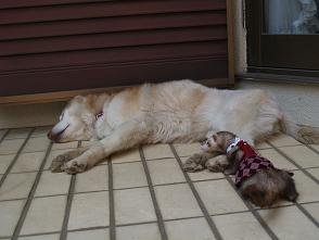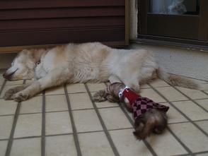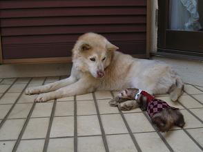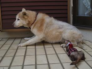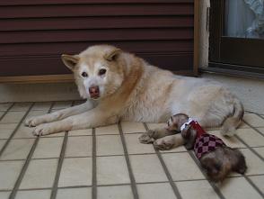 | 最初にれの字がティーのアンヨを噛んでしまったため、以来ティーがれの字を避けています。 れの字の姿を見ると逃げるティーです。 我が家で一番の長老で、全てを理解してくれている老犬。 唯一安心してれの字と一緒の部屋に入れることができる動物です。 以下、「あたちのにっき」より。 |