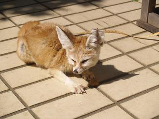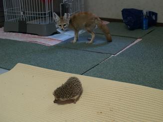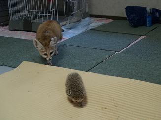 | 「君子危うきに近寄らず」 この教えをひたすら守る動物・フェネックのファラオ。 当然ですが、ハリネズミに対しても興味はあるものの触ったりは絶対にしません。 |