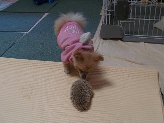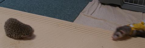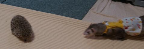| 一番敬遠される動物かと思いきや、れの字が一番好きなペット。 部屋の中を動き回るハリネズミを、何回刺されても追いかけています。 ハリネズミさんとの初対面は去年のことでした。 らんちさん宅の「お銀ちゃん」と。 以下、「あたちのにっき」より。 |