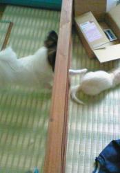 | れの字がファラオを追い掛け回し、ファラオは逃げまくる。 ファラオの背中にれの字が じゃーんぷっ☆ 楽しそうに追いかけっこしているのですが、楽しいのはれの字だけみたいです。 しばらくすると、ファラオが「しつこいんだよっっ!」と怒鳴り散らすのです。 以下、ファラオとれの字の初顔合わせ。(あたちのにっきより) |