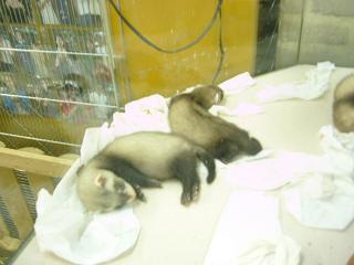 | お魚かぞく 「フェレットは絶対にノーマルに限る」という店主さんの強いこだわりのもと、常時数十頭のノーマルフェレットが 飼い主を待っています。 お店のメインはチンチラですが、それ以外にもフェレットを始めスキニーギニアピッグ・ ハムスターといった小動物に力を入れています。 とても小さなお店なので、「え、ここ?」と不安を抱く店構えですが、一歩店内に入ればノーマル臭があなたを迎えてくれます。 「もう少しケージ内を掃除したり、少しは自然の光が当たる場所にケージを置いてあげればいいかも。」 という、ちょい余計なお世話をしたくなるお店ですが、店主さんのフェレットにかける情熱はハンパではありません。 2009年1月1日情報 こちらのページ(ページ閉鎖)では、このお店で生まれたまさに「生まれたて」の赤ちゃんの写真が見られます。 ブログもあります。最新情報はこまめにチェックしてみてください。 2007年生まれのノーマルフェレットが6万3千円でオス・メス共に販売中。 でも必ず店長さんとじーーーっくりお話なさってください。 そのフェレットを本当にシアワセにしてくれそうか?判断なさるのは店長さんです。 2012年11月14日現在 実際にお店に訪れて店長さんとお話したところ、フェレットはもうやめたとのことです。 フェレットは病気が多いので、ハンパな気持ちの人には飼ってもらいたくないという店長の強い思い。 初めてフェレットを飼うという人には病気のことをたくさん説明してしまい、そのため客を逃してしまったとのこと(笑) 繁殖していたフェレットたちは、店長のもとで余生を過ごしています。 |