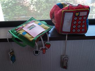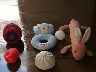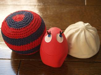 | お友達のSさんからいただいた肉まん。 ぽんままさんからいただいたタマゴちゃん。 あとは編み編みボール。 興奮しながらテレビ台の後ろに運んで終わり! 運んだ後、ご本人はかなり満足気です。 |