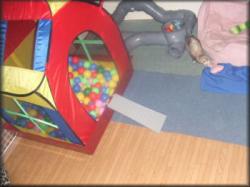 | 左にはボールが入った小さなお家。 奥の灰色はトンネル。(ホームセンターで売っている パイプをつなげたものだと思われます。) そしてピンクのベッドを配置。 これは楽しい遊び部屋ですね♪ |