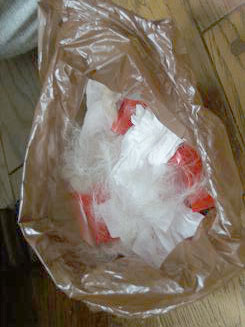 | 赤いのはガムテープです。 ブラッシング担当者の服に付いた毛を ペタペタとテープで取ります。 |