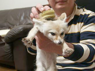 | ステロイドの副作用で 顔も手もパンパンに腫れている家族の者が フジコのブラッシング担当を請け負っています。 ← フジコのブラッシング風景。 |