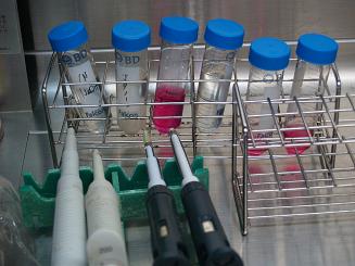 | 雑菌が入ってしまうと細胞が生き続けるのは難しくなります。 無菌状態をしっかりと保ちながら 細胞を採取することが必要です。 1.研究所内部をアルコール消毒します。 2.鈴木先生も手を洗い、 アルコールで自分の皮膚をよく消毒します。 3.器具を用意します。 ← この滅菌器で器具を殺菌してから使うのですが、 一度手で触った器具を細胞採取の間に再度使うこともあるため、 器具は細胞採取中にバーナーで焼いて 消毒しながら使うことになります。 |