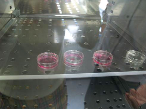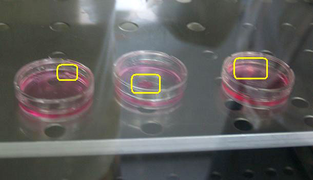 | 培養に失敗することもあるため、あえて複数個のシャーレで培養します。 1週間もすれば、細胞が無事に培養されている(=生きている)ことが確認できます。 |