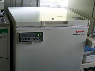 | 採取されてすぐの細胞も 培養されて生存が確認できた細胞も すぐには保存庫には入りません。 どちらもこの冷凍庫で1晩寝かせてから 液体窒素で充満した保存庫に入ります。 そう。お魚さんを買ってきて すぐに自宅の水槽に放して泳がせることはNGですよね。 しばらく水温に慣れさせてから ゆっくりと水に放つ。 それと全く同じで、採取後・培養後すぐに液体窒素に入れずに 冷凍庫ですこし足慣らし(?)させてから 保存庫へと格納するのです。 |