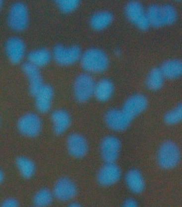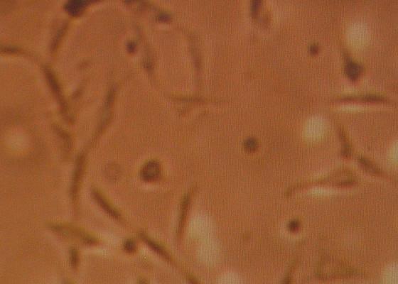 | 培養されて1週間後の細胞。着実に増殖しています。 ちょっとツンツンした感じの細胞ちゃん。 これを利用するにはトリプシンという酵素を使って処理する必要があります。 |
