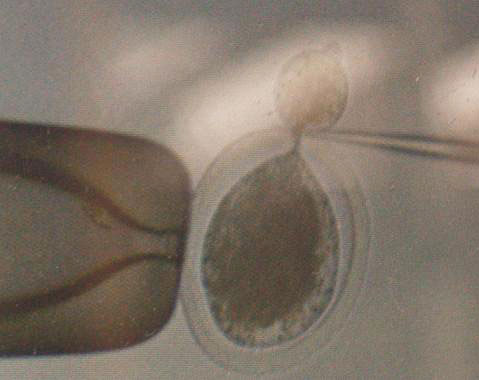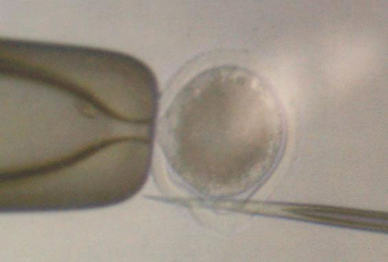 | 卵子にこのクローン細胞を1個入れました。 写真下側に白っぽく写っているのがその細胞です。 |