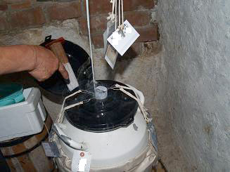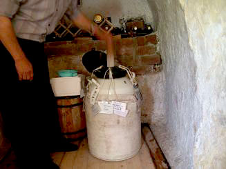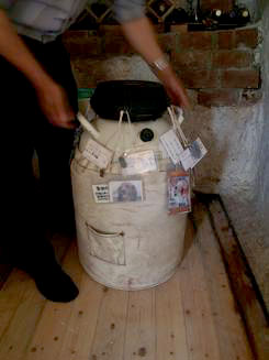 | わざわざ洞窟を掘って保存庫の安置場所を作ったのは 四季を通じて温度が安定しているためです。 暑い場所にこの保存庫を置いていたら 中の液体窒素があっという間に消費されてしまうのです。 気温が安定している洞窟内においても液体窒素は日々消失されており 鈴木先生は月に1回の頻度で液体窒素を補充しています。 重量のある液体窒素。 加えて1回のチッソ補充には3000円分の窒素が必要です。 |